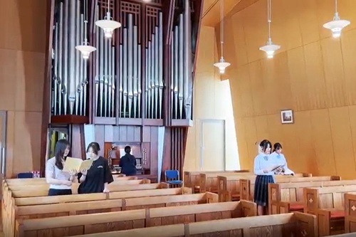 2025年9月23日(火・秋分の日)神戸国際大学チャペルにて、附属生対象のパイプオルガン体験会が実施されました。パイプオルガンは管楽器の一種で、ひとつのパイプからはひとつの音しか出ません。ですので、いろんな音を出そうとすると、その分パイプの数を増やさねばならず、大きなスペースと複雑なシステムが必要になります。このオルガンはパイプが1758本、操作する鍵盤も手用が2段、足用が1段というかなり大きなものです。オルガンは礼拝やコンサートを始めとしていろいろな機会に演奏され、学生教職員に広く開かれています。