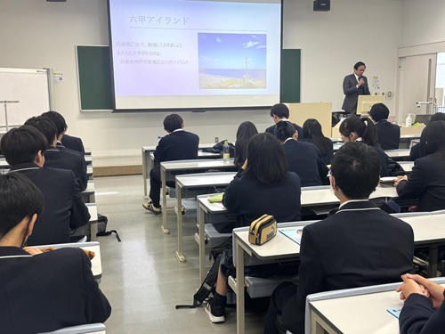 2025年11月12日(水)、総合進学コース国際大クラスは神戸国際大学を訪れ、経済学部上田ゼミのプロジェクト発表を聴きました。同ゼミは、昨年2月に行われた社会人基礎力グランプリで、神戸スーパースタジアム(株式会社SCコミュニケーションズ)との共同プロジェクトについて報告し、近畿地区大会で優秀賞を受賞しました。テーマは「人と企業のつながりで六甲アイランドを再び活気あふれる地域に」。この度は、附属高校OBで同ゼミ所属の西田有輝也さん(4回生)が発表してくれました。