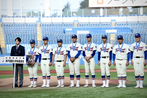 明治神宮と日本学生野球協会が主催で行われた第56回明治神宮野球大会が2025年11月14日~19日、明治神宮球場で行われました。硬式野球部は初戦で中京大中京と対戦し打線爆発の大勝。準決勝の英明戦では投打かみ合い勝利。迎えた決勝戦、相手は選抜準優勝の実績がある九州国際大学付属高等学校。 初回から3失点、トータルで13安打11失点となり、初戦・準決勝で5本塁打を記録した打線も振るわず敗北を喫しました。16年ぶり3回目となる近畿大会優勝を経て掴んだ神宮大会出場。準優勝おめでとうございます!