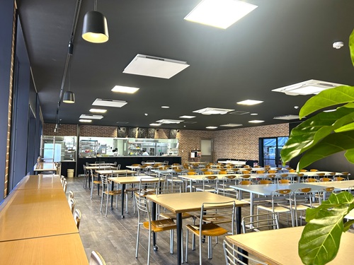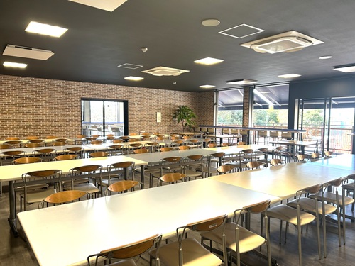 本館にあった食堂は幕を閉じ、2025年11月25日(火)新施設カフェテリアがオープンしました。レンガ調の壁に照明や天井の黒い色がアクセント。スタッフのユニフォームも黒に一新。BGMも準備しています。生徒の皆さんのご利用をお待ちしています。