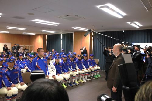 この度は本校を選んでいただきありがとうございます。投打共にスターなるような飛び抜けた選手はいませんが、バッテリーを中心とした守りの固いチームです。主将の井本を中心に自慢のチーム力で全力を尽くし、一戦一戦、戦っていきます。皆様の温かい応援を宜しくお願いします。