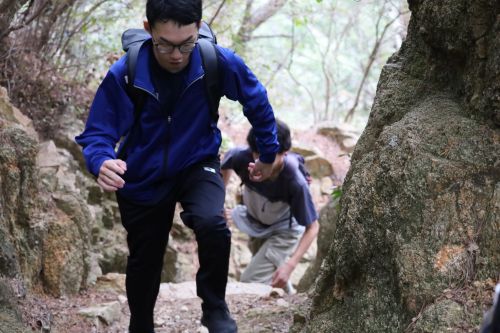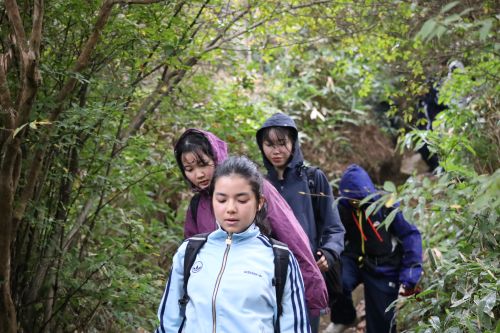 標高は高く、距離も長いものの、比較的平坦な地形の続く東コースでは、生徒・教員有志と卒業生の約30名名が新神戸から市ケ原で縦走路に接続、宝塚を目指しました。摩耶山上の掬星台に登ってしまえば、あとは六甲山上のドライブウェイとトレイルを交互に歩きつつ次第に高度を上げていき、六甲山最高峰へ。ここまでは、穏やかな天気に恵まれて、すこぶる順調。ところが、さすが山の天気は予報通りには読めないものです。最高峰下のドライブウェイから最後のトレイル、宝塚まであと3時間の地点で、小雨が降りだしました。ここまで来たら交通機関との接続ポイントやエスケープルートはなく、下山はゴール一択。トレイル半ばで雨は本降りに。雨水は上着や雨合羽等の内側にもしみ込みました。それでも大きな遅れはなく、一行は無事に宝塚駅に到着。あっぱれ、生徒諸君、今夜は温かいお風呂でゆるりと休んでくださいね。